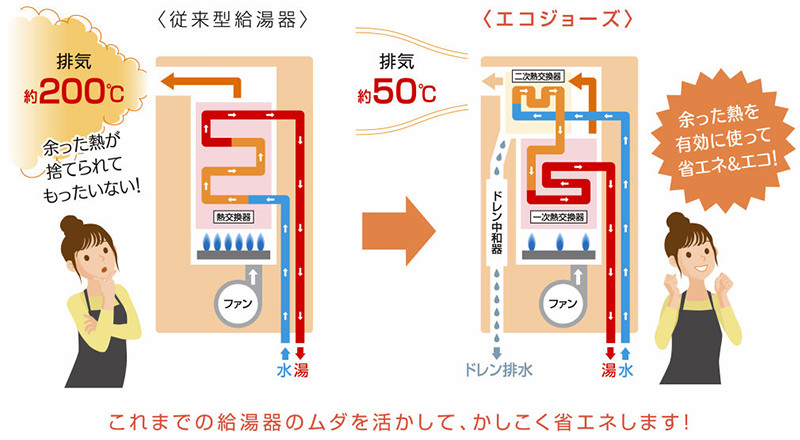 従来のガス給湯器とどう違うのかというと、従来の物が捨てていた高い排気熱を回収して、再利用しているため熱効率が従来の約80%から95%に向上し、使用するガスの量を削減してガス料金の節約とCO2排出量の削減します。